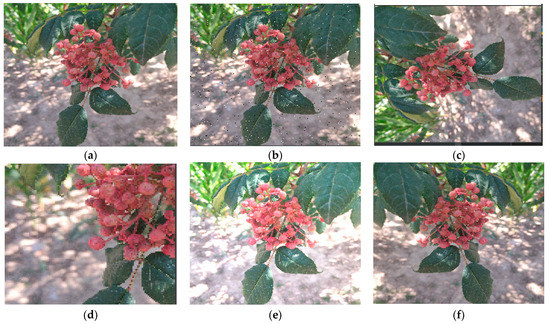 Image enhancement results. (a) Ripe Zanthoxylum string; (b) Increased noise result; (c) Rotation result; (d) Random clipping result; (e) Increased brightness result; (f) Mirror flip result.