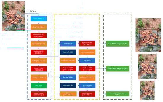 The YOLOv5s framework consists of a backbone, neck and head. The backbone aggregates the input image information by different types of image granularity to form the convolutional neural network of image features. The neck transmits the output image of the backbone layer to the prediction layer in a pyramid mixed structure. The head generates prediction boxes and categories based on image features transmitted by the neck, as shown in Figure 3.