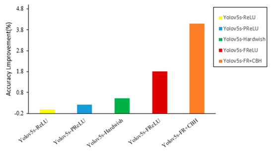 Usually, immediately after capturing the spatial dependency in a convolution layer linearly, an activation layer acts as a scalar nonlinear transformation. Many insightful activations have been proposed, such as ReLU, PReLU, Hardwish and FReLU, but improving their performance on visual tasks is challenging. Therefore, currently, the most widely used activation is still ReLU. We set the ReLU network as the baseline and show the relative improvement in accuracy on the basic tasks in computer vision: object detection (mAP). As shown in Figure 6, we trained YOLOv5s over the Zanthoxylum dataset to evaluate the generalization performance of the model on this dataset. FReLU is more effective and transfers better on the tasks.
