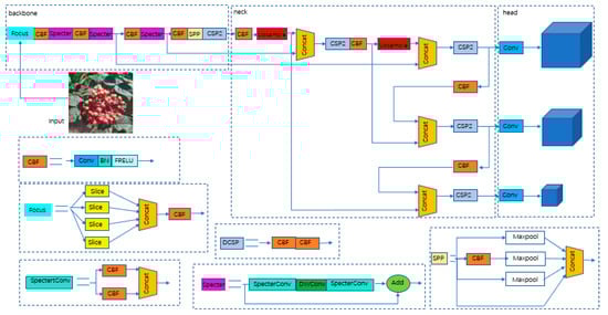 - Considering the multicluster nature of Zanthoxylum fruit, a detection module with the addition of the FReLU activation function was adopted to effectively improve the efficiency and accuracy of fruit recognition. By changing the CSP module in the backbone, a lightweight Specter module was proposed to accelerate the convergence speed of the training network and reduce the impact on the scale loss.