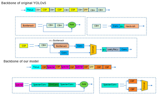 Backbone before and after improvement. The CBH module is composed of the Conv (convolution), BN (batch normalization) and Hardwish activation functions.