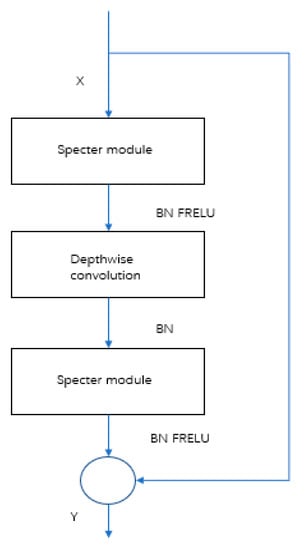 The structure of the Specter bottleneck is shown in Figure 9. It consists of two Specter modules. In this network model, the number of channels was first increased by the Specter module, then features were integrated by deep convolution. Finally, the number of channels was adjusted by the Specter module, which was the same as the number of channels in another process, and added to obtain the output feature information. The Specter module could change the number of input channels by changing the number of convolution kernels. To effectively reduce parameter redundancy and increase the geometric characteristic information of prickly pepper fruit, a convolution layer was added to the two Specter modules. BN was added after the convolutional layer of each module, and the FReLU [37] activation function was added after the convolutional layer of the two Specter modules to improve the expressive ability of the neural network.