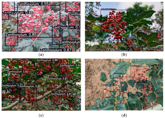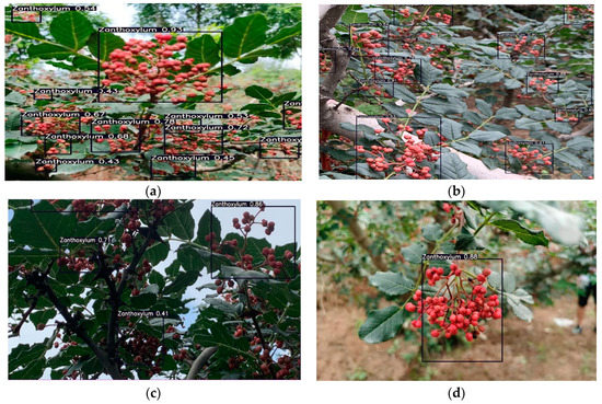 Recognition results of Zanthoxylum by the improved YOLOv5s network in the morning. (a) Multiple clusters of blocked Zanthoxylum fruit. (b) Multiple clusters of unblocked Zanthoxylum fruit. (c) Single cluster of Zanthoxylum fruit under backlight. (d) Single cluster of Zanthoxylum fruit under sunlight.