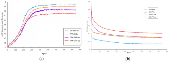 Comparison of different detection models. (a) mAP curve; (b) Loss curve.