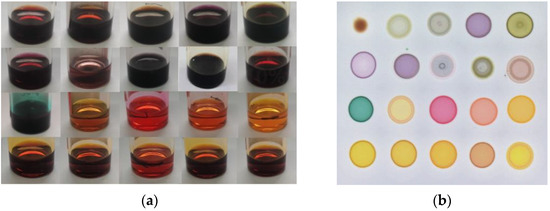 In this study, color-sensitive materials were synthesized according to the classic Lindsey methodology in the laboratory [20,21]. Twenty color-sensitive materials were dissolved in N,N-Dimethylformamide (DMF) with a concentration of 2.0 mg/mL, as shown in Figure 1a, and then poured into a silica gel plate (Merck, Germany) through a capillary tube (0.5 mm × 100 mm), structing a 4 × 5 sensor array, as shown in Figure 1b.