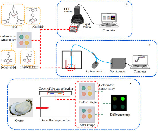 The schematic diagram of colorimetric sensor array system (a), visible near-infrared spectroscopy system (b) and difference map acquisition of oysters (c).
