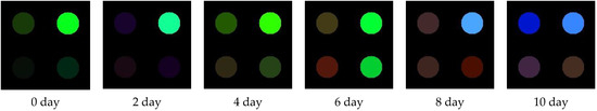 Average color change profiles were obtained from oyster samples with different storage times. Figure 3 shows the difference maps of the VOCs of oyster samples with a storage time of 0, 2, 4, 6, 8 and 10 days of being exposed to the colorimetric sensor array. As shown in Figure 3, the colorimetric sensor array has its specific colorific fingerprint of the VOCs from the oyster samples with different storage times, which indicates that the oyster samples at different storage periods have their specific VOCs.
