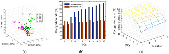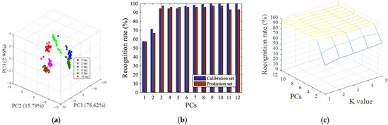 After SNV preprocessing, siPLS interval screening, and GA variable screening, the pattern recognition results of visual near-infrared spectroscopy data were shown in Figure 6. Figure 6a shows a 3D space of all of the oyster samples with different storage time, the cumulative variance contribution rate of the first three principal components reached 97.37% (PC1 was 78.62%, PC2 was 15.79%, and PC3 was 2.96%). It can be seen from Figure 6a that, compared with the parameters of image processing, the clusters of samples between different categories were more clustered. The fresh oysters (0 days) could be directly distinguished from samples which were stored at 4 °C for more than four days. The LDA model and KNN model were also used to predict the storage time of oyster samples, as shown in Figure 6b, when the number of principal component factors was nine, 100% of the calibration set samples were classified correctly, and 97.22% of the prediction set samples were classified correctly, as indicated in Figure 6c. When the number of principal components was 11 and the K value was 1, the best recognition rate of the prediction set was 97.22%, and the recognition rate of the calibration set was 99.07%.