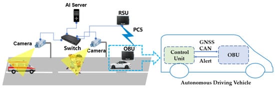 Firstly, RSU as a roadside equipment receives information from outside sources, such as AI servers, 4G/5G telecommunication network. Then, it broadcasts this information by PC5 interface using a unified message format in its coverage field, the maximum reachable radius can be one kilometer if there are not obstacles such as buildings or trees. Secondly, OBU is connected with control unit Industrial PC (IPC) of the autonomous driving system via Transmission Control Protocol (TCP)/Internet Protocol (IP) protocol. The OBU with 12V power is provided by vehicle, and antennas of OBU should be installed outside of vehicle for better messages receiving. After a successful 3-way TCP/IP handshake connection between OBU and control unit of autonomous vehicle, OBU can receive Global Navigation System Satellite (GNSS) and Controller Area Network (CAN) messages from the vehicle’s control unit. Thirdly, combining with vulnerable road user information from RSU, OBU can instantly judge the status of road safety and notify autonomous driving control unit.