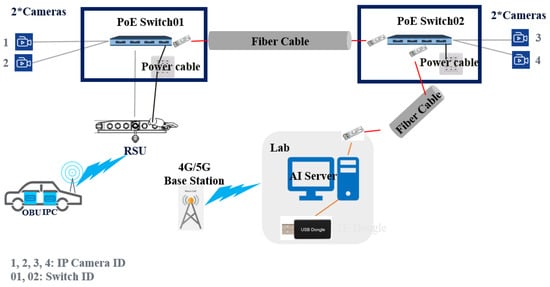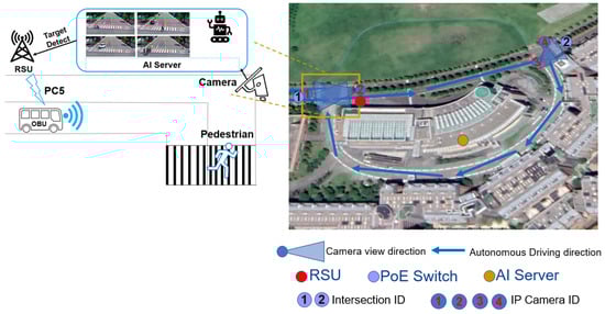 Based on the above system architecture in Figure 2, we select one circular route to deploy and verify our solution. Normally, autonomous driving vehicle cannot know any NLOS object by its own IP camera from a long distance. For instance, there is one person is running at 500 meters beyond with a 90-degree corner of the street. To meet high cost-performance demand, one RSU is installed at site as shown by red color dot, it is sufficient to cover both intersection 1 and 2. The orange color dot is AI server position. For monitoring pedestrians in different road directions, we build up two IP Cameras at the left intersection, and two IP Cameras at the right intersection. Two Power over Ethernet (PoE) switches are used as a whole network backbone connection.