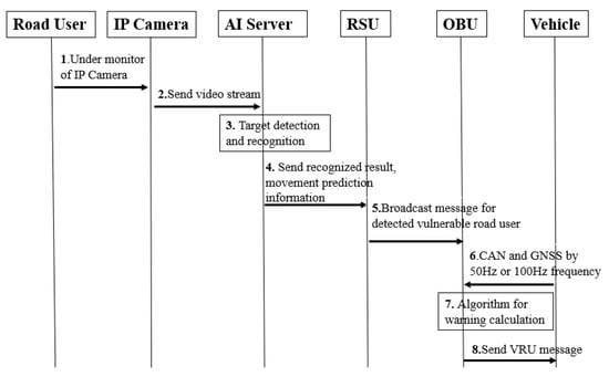 According to Figure 6, IP camera sends video stream to AI Server. The image size 2592 × 1944 and image extraction speed 10 frames per second are used in our solution. The AI server equipped with the target classification algorithm is utilized to determine the pedestrian’s category results, which include person, car, motorcycle, person with umbrella, baby carriage and person at night. If pedestrian passes this area under camera coverage, AI server will detect this object and transfer object recognition, position information and movement prediction analysis results to RSU. RSU encapsulates these messages into broadcast packages and broadcasts these information to all the OBUs within the coverage area of RSU. Meanwhile, autonomous driving vehicle’s control unit sends GNSS and CAN messages to OBU by 50 Hz or 100 Hz frequency. OBU is responsible for combining all the information to determine if a collision is approaching. We use below Algorithm 1 for collision warning trigger threshold after detecting an object. S is the distance between host vehicle and pedestrian. V is the speed of host vehicle. When all the trigger points are met for alert threshold, a VRU warning message will be sent out from OBU to autonomous vehicle control unit. Autonomous vehicle own control policy for slowing down or stopping is out scope of our solution.
