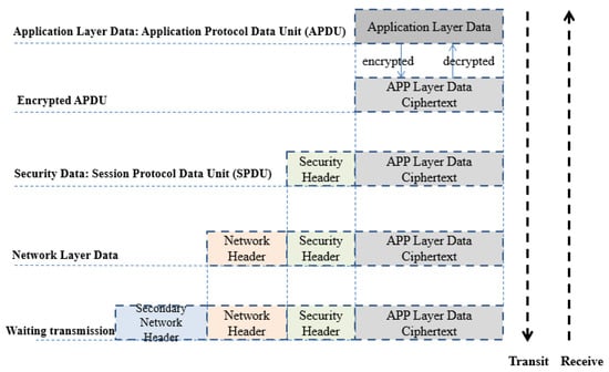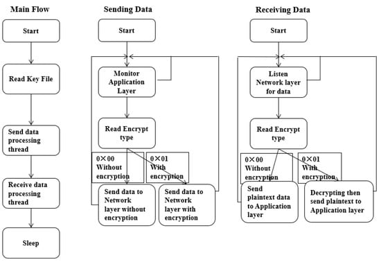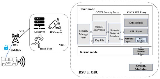 According to message header definition in Figure 10, security packet messages are encapsulated and de-encapsulated as designed. In Figure 11, before wireless device communication with security support, we first generate key profile by using our key file management tool, then input same key files into C-V2X RSU and OBU in both Sending/Receiving thread, active or inactive security function in both devices keeps same. During RSU sending data, its C-V2X security proxy is responsible for monitoring and reading the status of C-V2X application proxy, if encrypt type “0 × 01” is gotten, data will be sent to security proxy for encryption progress. Another communication side, OBU is listening on receiving data, when encrypt type “0 × 01” encryption is detected, it will proceed decryption procedure then send plain-text to application layer of device for executing C-V2X services such as our VRUCW solution for example. Without same key profile or encrypt type, RSU and OBU cannot talk each other so as to achieve a guarantee of C-V2X Sidelink transmission security in the field experiment.