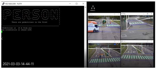 By means of real time streaming protocol (RTSP) media stream technology, as specified in [], the view screens of four IP cameras are put on one display desktop of a computer together. This means that whether road users can be detected or recognized is intuitively observed. Meanwhile, we build up a putty tool [] to access linux system of OBU device; then, we can monitor both road users and status of OBU alarm trigger at same time. When one person is passing the road, as seen in camera screen of the bottom-left corner, according to message flow in Figure 6 and Algorithm 1, once the OBU of autonomous driving vehicle detects a potential collision possibility, a warning message “PERSON” as designed will pop up in OBU putty tool as showed in Figure 12. Simultaneously, OBU sends this warning message to autonomous driving control system for slowing down or stopping. Finally, with our proposed solution, we have successfully launched the C-V2X VRUCW function in the field. It proves that our solution is workable and can help autonomous driving to avoid accidents, especially in NLOS situation.