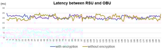 Because VRUCW is time-sensitive service, we are worried that low latency performance can’t be satisfied due to adding extra software security function. To eliminate this concern, we implemented C-V2X PC5 Sidelink transmission latency testing before and after security function activation in Figure 13.