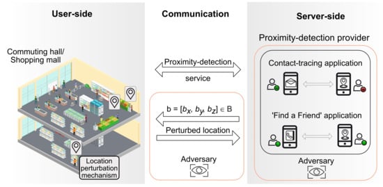 The wireless communication process between user/edge devices and the proximity-detection service is depicted in Figure 3. Users are assumed to be spread across a multi-floor space of commercial or commuting interest (e.g., shopping mall, commuting hall/airport/ train station, etc.). Users’ devices are supposed to be equipped with a localization engine, such as GNSS, WiFi, BLE or a combination of several localization methods. A proximity service provider is operating in the building of interest, with access to the building floor plans and able to send the floor-map coordinates b to all users interested in the proximity-based service or application. The coordinates can be provided as Earth Centered Earth Fixed (ECEF) coordinates, as (latitude, longitude, and altitude)-coordinates, or as local coordinates () and the mapping between any of these coordinate systems is assumed known both at the user side and at the server side. The user devices performs the location perturbation locally and sends the perturbed location to the server; the server processes in an aggregate form all the data based on the perturbed locations of the users inside the building and offers the proximity-based service to the users.