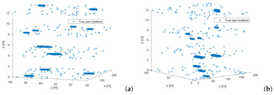 Two examples of users distribution within a 4-floor building during two Monte Carlo runs. (a) Monte Carlo run 1; (b) Monte Carlo run 2. In these runs, we allocated of users are in hotspot areas and of users are outside hotspot areas, uniformly distributed within the building.