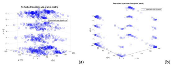 In order for and metrics to remain inside the building space and to offer plausible perturbed locations, an additional correction is done after the mappings in Equations (1) and (2), in such a way that the points that would fall outside the building edges, are re-mapped to the nearest point inside the building. In addition, if the perturbed z coordinate does not match any of the floor heights in the building, then the perturbed z-coordinate is mapped to the nearest floor level. Examples will be provided in Section 5.