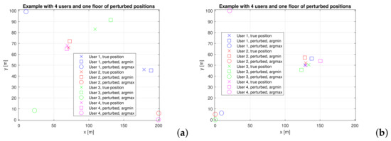 A zoomed version of perturbed locations for one floor and with only 4 users is illustrated in Figure 6, this time showing both the scenario with no hotspots (left plot) and with hotspots (right plot). The squares show the perturbed location via argmin metric and the circles show the perturbed location via argmax metric.