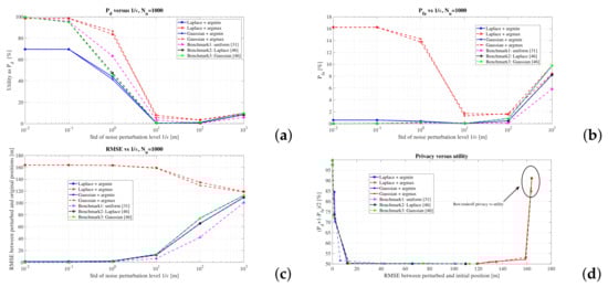Comparison with state-of-the-art algorithms: (a) versus the noise perturbation level; (b) versus the noise perturbation level; (c) RMSE between the perturbed location and original location versus the noise perturbation level; (d) utility versus privacy.