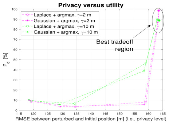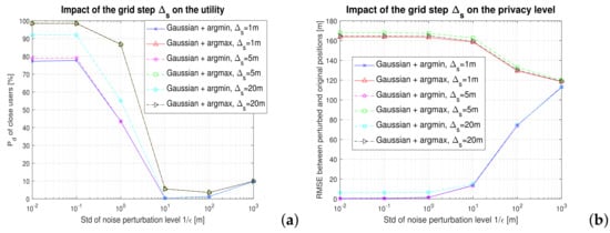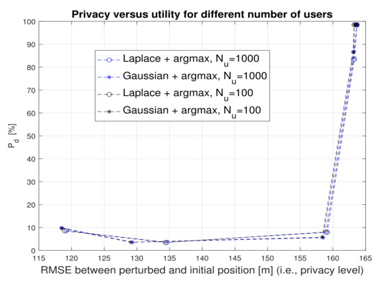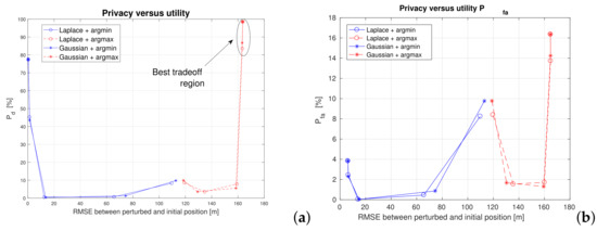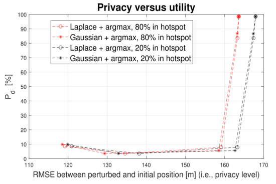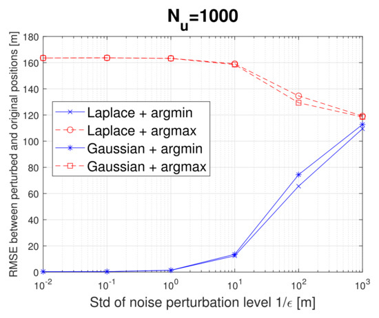 The RMSE between the transmitted perturbed location and the original location, as defined in Equation (11), is shown in Figure 8. A higher RMSE value means a higher user privacy level. There is no significant difference between the noise type used in the perturbation mechanism, with the Laplacian noise giving slightly better results than the Gaussian one in terms of privacy for the argmax metric, and the Gaussian noise giving slightly better results in terms of privacy for the argmin metric.