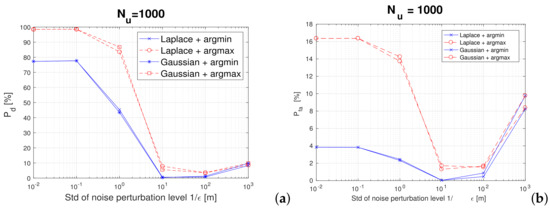 Examples of perturbed locations during one Monte Carlo run with argmin metric (left plot) and argmax metric (right plot) are shown in Figure 5, for and Laplacian noise.