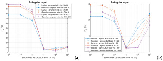 In Figure 15, the different building sizes are compared for a fixed number of users . Here, the added noise in the perturbation yields similar results independent of its type. However, levels are high up, as close to 100% for the largest building size, namely 20 × 20 m. Whereas the smallest building considered in the simulation, with the dimensions of 100 × 200 m, shows moderate and levels, accordingly. One could translate the situation with a fixed number of users and varying building sizes into the density of the users, where a little space is offered to each user per se.
