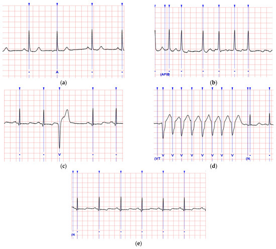 The MIT-BIH arrhythmia database’s resource web site [18] presents the ECG data with annotations at the interest time points for various symptoms. We adopted the symptoms, including the normal status (NSR) and the abnormal conditions in the atrium (APC and AFib) and the ventricle (VPC and VT), for sampling in our model. The waveforms of the arrhythmia described above are shown in Figure 2a–e. Their definitions referring to the visible characteristics are addressed below.