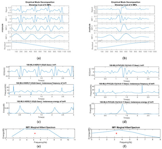 Spectrum analyses in the time–frequency domain due to the HHT process for normal and arrhythmia ECG signals exemplified by NSR and VPC: (a) NSR IMFs due to the fact of EMD; (b) VPC IMFs due to the fact of EMD; (c) NSRs’ instantaneous frequency and energy; (d) VPCs’ instantaneous frequency and energy; (e) NSR MHS and centroid (red star) for IMF1; (f) VPC MHS and centroid (red star) for IMF1.