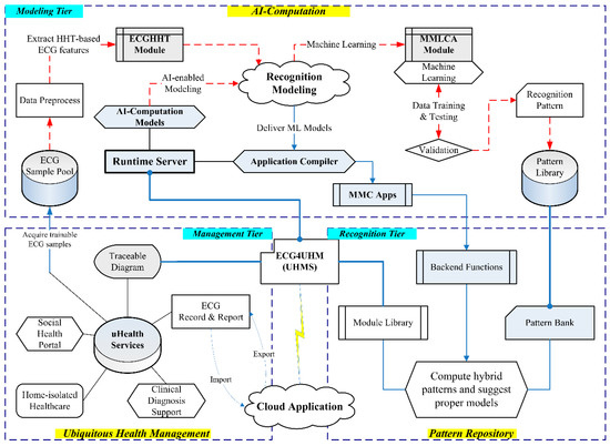 The UHMS infrastructure, as shown in Figure 4, integrates the Java-based web platform “ECG4UHM” with the MATLABTM runtime server (MRS) to enable AI computation with the proposed ML models for cloud applications in real-time arrhythmia recognition. The modeling and recognition tiers include the dashed and solid arrow lines, respectively, for the manual data training and automatic recognition processes. The platform was constructed by Java development kit 1.8.0 and MATLABTM 2020b. The infrastructure comprises the modeling, recognition, and management tiers to manage the MRS functions and uHealth services.