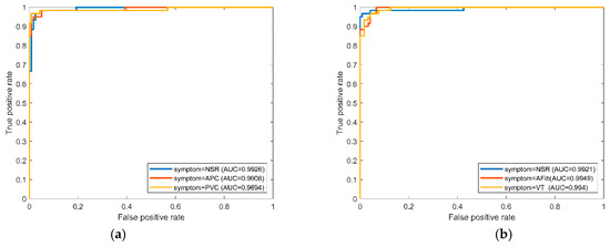 We compared NSR versus APC and VPC (i.e., premature pattern) in data set (A) trained by the RF model with cross-validation, and the best ROC curves are shown in Figure 5a. The best accuracy and AUC reached 0.99, which can be referred to in the past study [20]. If the NSR mixed with AFib and VT (i.e., the fibril-rapid pattern), the AUC, shown in Figure 5b, was approximately 0.99 on average. The evaluation approved the reliability of the suggested models.