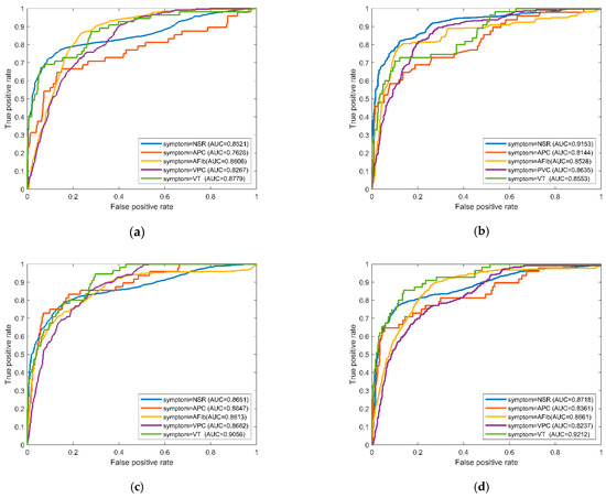 By comparing the ML models’ effectiveness in coupling analysis, we suggested the parameters shown in Table 2 for the proposed models. With the five-symptom set {NSR, APC, AFib, VPC, and VT}, recognition for each symptom versus the rest (i.e., one-versus-rest mode, OVR) was evaluated by the sensitivity, specificity, and area under the curve (AUC) of receiver operating characteristics (ROC) in the modeling. The sensitivity and 1-specificity constructed the ROC curve for the possible cut-point values [41]. The formulations, as shown in Equation (4), comprised the number of true-positive (TP), true-negative (TN), false-positive (FP), and false-negative (FN) data for calculating the accuracy, sensitivity, and specificity due to the ROC to perform the model’s effectiveness. We computed the average accuracy, sensitivity, and specificity of the model’s ROC for evaluation.