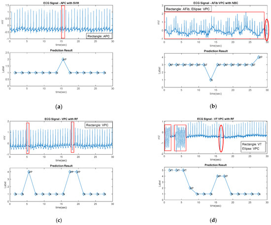 With the above evaluation, we can suggest the proper models to identify arrhythmia patterns in the UHMS. The proposed modeling was applied to practical cases through the ECGHHT and MMLCA modules. We selected the cases reported to have APC, AFib, VPC, or VT from the official website and screened their records by a 3 s frame with a 1 s overlap during 30 s of an arrhythmia period. The MHS-based features were extracted from each frame by ECGHHT. Then, the labels of APC, AFib, VPC, VT, and NSR could be recognized by MMLCA. Both modules were activated by the HHTFeature built in the ECG4UHM to enable AI computation. The multiclass recognitions of the arrhythmia symptom patterns regarding the original ECG are displayed in Figure 7a–d. Particularly, the NB and RF algorithms recognized the hybrid patterns, including the VPC mixing AFib and VT, as shown in Figure 7b,d, respectively. The traceable diagrams display the ECG signals on the time axis, mapping to the symptom labels highlighted in the associated frames. The modules approved the feasibility of AI computation for the ECG4UHM.