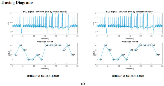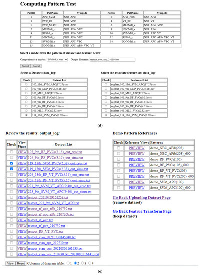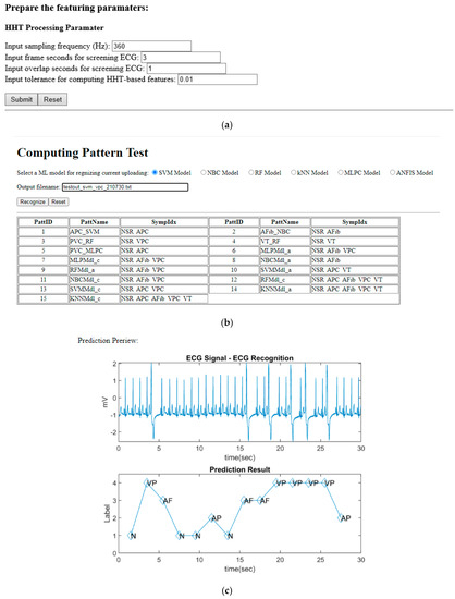 Furthermore, we practiced the ECG4UHM’s online recognition process. As shown in Figure 8a, the screen snapshot presents the interface for inputting the parameters to transform the uploaded ECG data set into the HHT-based features in the file named by the prefix “feat”. The models available for the various symptoms were suggested for choice as shown in Figure 8b. In addition, the user can compare the comprehensive models to recognize the hybrid arrhythmia patterns according to the ECG data set and the relevant feature set as shown in Figure 8c. The recognized result as shown in Figure 8d was traceable with symptom annotations with the AI computation. All traceable diagrams were saved in the fig_log for advanced management and review as shown in Figure 8e. The implementation approved the feasibility of the UHMS prototype for extensive applications of the uHealth services.