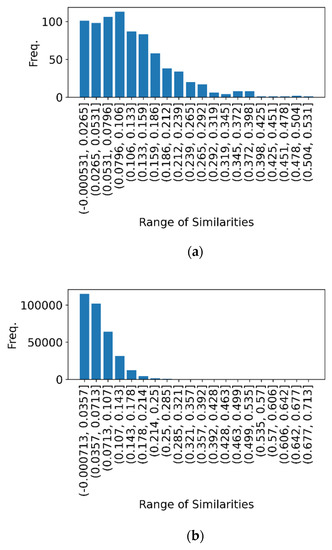 Distribution of similarity for topic sections. (a) Histogram of similarity for adjacent topic sections, (b) Histogram of similarity for all topic sections.
