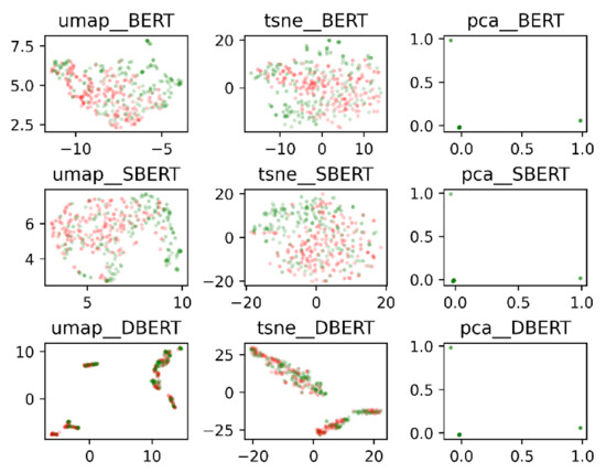 The feature vectors used in this study, BERT, DistilBERT, and Sentence BERT, were compressed into two dimensions and visualized to investigate the possibility of classification. Three-dimensional compression algorithms, UMAP [57], t-SNE [58], and PCA, were used for visualization. The results are shown in Figure 2. BERT indicates BERT-CLS, SBERT indicates Sentence BERT, and DBERT indicates DistilBERT.