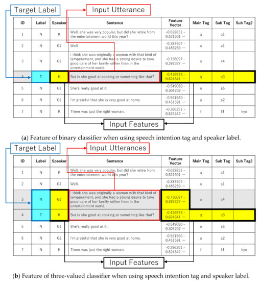 In the case of binary classification, a vector series of embedding of the input dialogue sentences can be represented as if the input is supplemented with a speech intention tag T. Furthermore, if we add a vector U representing the speaker type (interviewee or interviewer), it can be represented as .