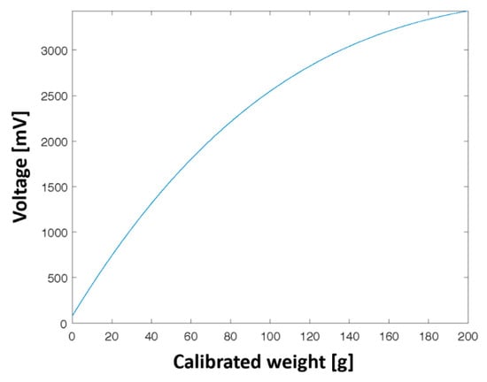 16]. The FSRs were experimentally characterized to obtain the actual response curve, considering the effect of the ADC conditioning circuit. Briefly, 8 sensors were tested by applying a sequence of calibration weights (i.e., 10, 20, 50, 100, and 200 g). After applying each weight, the sensor output was left to stabilize before noting the reading. For each weight, 10 measures were taken to average the outcome. From the experimental readings, we designed the fitting curve using a cubic polynomial regression (