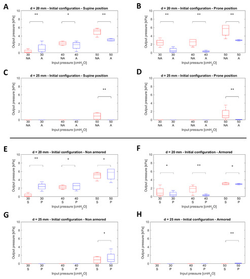 Figure 4E–H shows the dataset using a grouping based on the body position (S vs. P). In this case, we had a different scenario for the 20 mm trachea: when increasing the input pressures, the mean values tended to decrease in their significant statistical difference. Focusing on