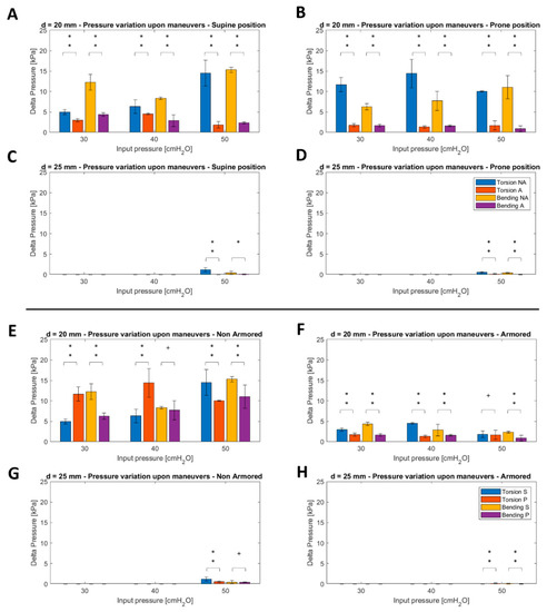 Figure 5E–H), even though the statistical differences between mean values were not confirmed in all cases. Specifically, this occurred in relation to the mean values associated with the bending maneuvers at 40 cmH