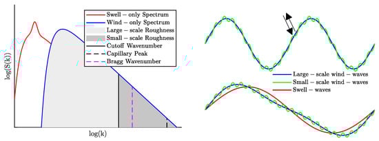 Notional ocean spectrum and resulting ocean waves. The (left) panel compares wind-only (blue) and swell-only (red) wave spectra. The wind-only spectrum is divided along the cutoff wavenumber to distinguish large- and small-scale roughness contributions. The Bragg and capillary wavenumbers are also shown for reference. The (right) panel shows notional wind waves (top) and wind and swell waves (bottom), while arrows indicate incident and backscattered EM waves.
