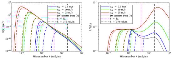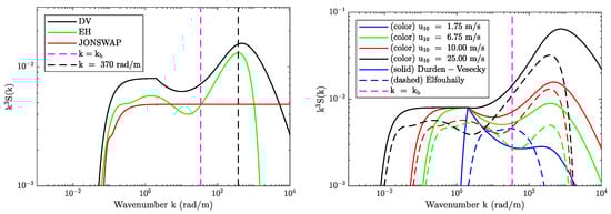 The left panel in Figure 3 compares the fully-developed Durden–Vesecky (DV-[]), Elfouhaily (EH-[]), and JONSWAP ([]) curvature spectra at the SMAP Bragg wavelength (indicated using the vertical dashed magenta line) for . While the JONSWAP and EH spectra show similar magnitudes, they differ considerably from the DV spectrum. Furthermore, the spectra in the vicinity of the Bragg wavenumber differ based on their description of the capillary peak and other factors.