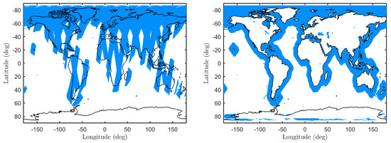 SMAP L1-C global coverage (HH-polarization at fore look direction) highlighted in blue. (Left): Daily global coverage on 30 May 2015 (emphasizes individual SMAP passes). (Right): Composite near-coastal coverage mask for all available data.