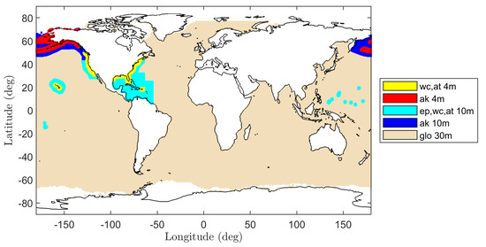 The combined WW3/GFS wind and wave products are available at 1 hour time increments over three spatial resolutions as shown in Figure 5: (1) 4 arc-min (≈7 km) over coasts of the continental United States, Alaska, Puerto Rico, and Hawaii, labeled wc_4m, at_4m, and ak_4m; (2) 10 arc-min (≈18 km) over 4 arc-min regions and the US territories in the southern pacific labeled wc_10m, at_10m, ak_10m, and ep_10m; and (3) 30 arc-min (≈55 km) globally labeled glo_30m. Although wind and wave predictions at resolutions finer than even 7 km are desirable when predicting SMAP 1 km radar backscatter, the global availability of the WW3/GFS data, especially in the southern hemisphere where prominent swell waves are present, motivates the use of the 30 arc-min wind product, with finer resolution wind products used for additional verification purposes.