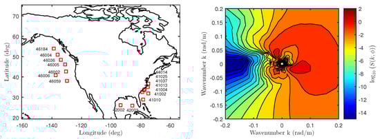 The 1D swell-only spectrum model to be discussed in Section 5.1 utilizes 2D NDBC buoy spectra []. They are arranged in a [50 × 36] [frequency × azimuth] grid and are computed every 3 h daily starting at midnight. The 2D directional spectra are estimated using a simpler directional Fourier approach, and do not use advanced methods such as the Maximum Likelihood Method (MEM) or Maximum Entropy Method (MEM) []. The azimuth grid is uniformly sampled at every while the frequency grid is non-uniformly sampled between Hz and Hz. This study uses data from 16 buoys over May, June, and July of 2014 and 2015 with locations shown in Figure 6. An example 2D spectrum oriented in the up-cross-wind direction (-axis indicates the up-wind direction) is also shown with contributions from wind and multiple swell systems with peak periods between s.