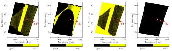SMAP L1-C quality flags for orbit 01318D on 1 May 2015 over Hawaii. Figures from (left) to (right) show noise, Faraday correction, look-quality, and presence of RFI. In each figure, the black region identifies high-fidelity data, while the yellow region identifies poor quality data. The overall quality mask is a combination of these and other quality flags. See [] for additional details.
