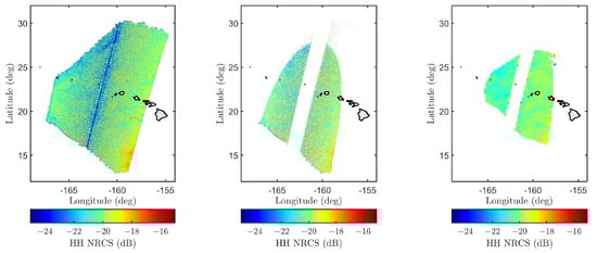 SMAP L1-C HH-polarized backscatter NRCS for orbit 01318D on 1 May 2015 over Hawaii. Figures from (left) to (right) show original SMAP measurements, high-fidelity measurements retained after applying quality flags, and SMAP NRCS degraded to ep_10m resolution.