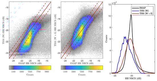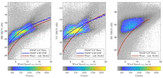 Figure 9 shows the resulting backscatter NRCS vs. wind speed scatter density plots for each polarization for the entire SMAP dataset. Each plot contains approximately 1.15 million scatter points with the vertical and horizontal axes (NRCS and wind) binned every 0.25 dB and 0.1 , respectively. The empirical GMF from [] (co-pol only) and the physics-based wind-only backscatter NRCS predictions (TSM for co-pol, SSA2 for cross-pol) are also overlaid to provide direct comparisons. The results show that the co-pol empirical model predictions capture the highest density portions of the scatter plot regions more accurately than the “wind-only” TSM predictions. The under-prediction of the TSM results is greater at lower wind speeds and diminishes with increasing wind speed, and also is greater for the HH polarization. Taken together, these observations suggest the presence of swell that is impacting the backscattered NRCS.