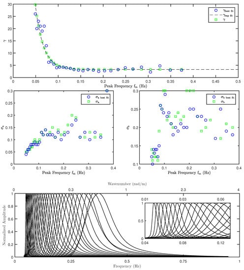 using least-squares minimization that resulted in , (both in normalized units), and s. The green squares in Figure 10 show values computed using Equation (21) at the NDBC spectrum frequencies used in the analysis. Similarly, variations in and are largely in agreement with []. The bottom plot finally illustrates the resulting modeled normalized 1D swell-only spectral shapes at each peak frequency.