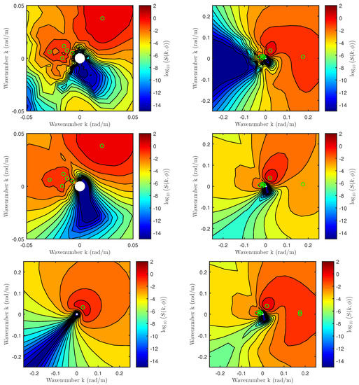 to ensure continuity at the rad/m boundary []. The spreading function is modeled as unity plus a wavenumber and wind speed dependent amplitude of . Note that diminishes rapidly for where is the wavenumber of the 1D spectrum peak. As a result, lower wavenumber bounds in Equations (3) and (5) are typically changed from 0 to . Components of Elfouhaily and JONSWAP spectra will also be used in subsequent sections for model refinements and swell spectrum modeling.