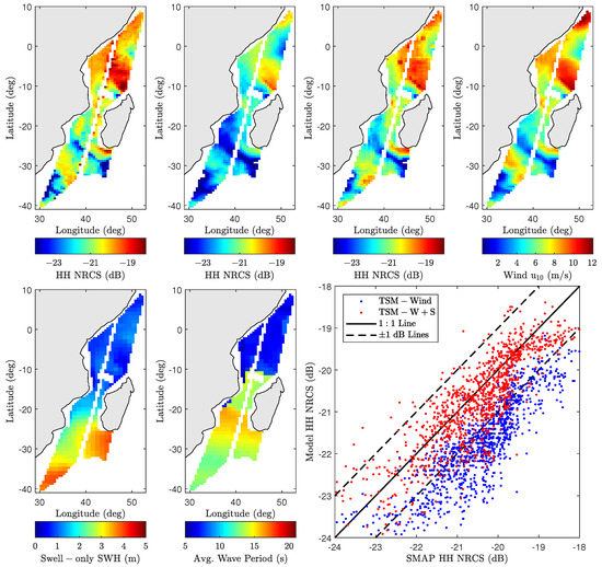 Figure 16 compares SMAP and model predictions for pass 02260_D on 5 July 2015, at 02:32:47 UTC near coastal Madagascar at the glo_30m spatial resolution. Measured and modeled backscatter NRCS maps highlight significant spatial modulations of radar returns, while the ancillary data maps (wind speed, swell-only SWH, and average wave period) highlight the underlying sources of these variations. While the wind-only predictions capture many large-scale features, they largely underestimate the SMAP measurements as expected. The inclusion of swell features, which predominantly occupy the lower half of the scene, significantly improves the overall model and measurement agreement. The prediction improvement is more clearly shown in the scatter plot, where the percentage of predictions within dB of SMAP measurements improves from 25% to 85%. Figure 17 further shows the corresponding backscatter NRCS measurements and model predictions at the original 1 km SMAP resolution. The high-resolution maps are also consistent with the results shown in Figure 16.